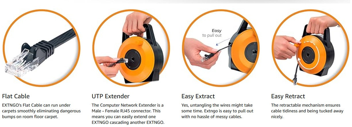 EXTNGO has been designed and built by IT professionals to overcome day to day problems facing technicians in the field that deal with temporary network setup. The concept is to have a very long cable that you could use it to connect your devices at a moderate long-distance like 50 Feet (15 Meter), yet, you could pass the cable underneath the carpet with lightweight out generating any bulges, same time to be able to use only the length you need and keep the extra away from the seen. Be small and light weight to carry around yet easily could extend the cable up to 100 feet (30 Meter) if so required. Ensure highly quality CAT6 cable specification and material that could withstand high amount of people passing over the cable without damaging the internal cabling. Based on these specifications EXTNGO was built and it has addressed each and every single point has been mentioned and even more.